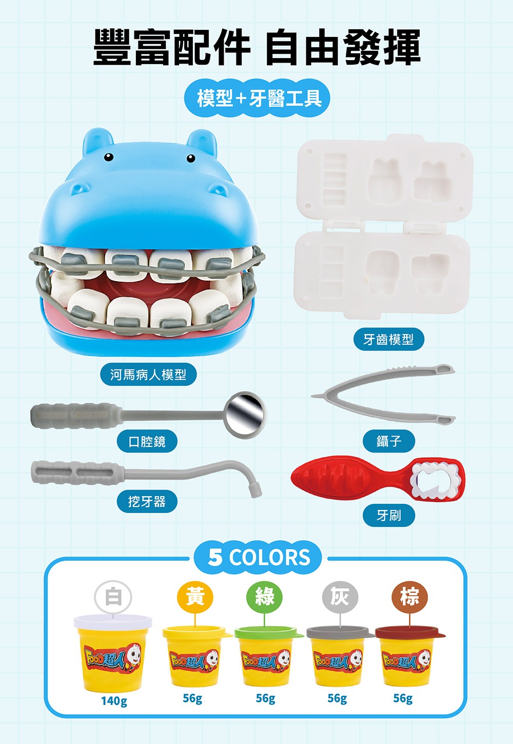 柔軟安全的小麥黏土搭配多樣牙醫配件,鼓勵孩子自由創作與情境想像,在捏塑、按壓與造型的過程中訓練手部精細動作與手眼協調能力,同時提升專注力與創造力。透過親子共玩與角色互動,讓學習不再只是說教,而是在歡樂遊戲中自然養成愛護牙齒的好習慣。