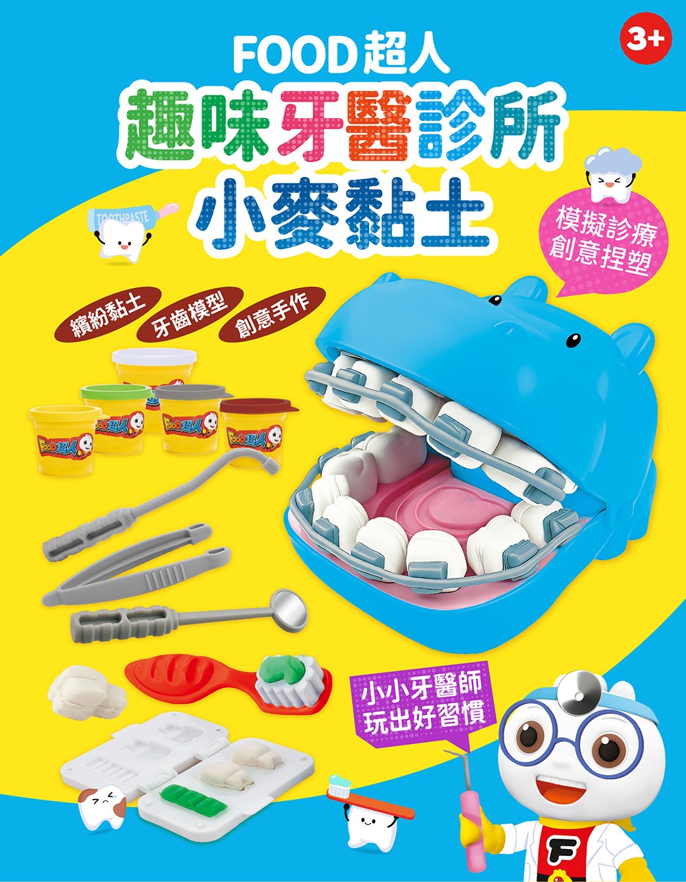 《FOOD超人 趣味牙醫診所小麥黏土》結合角色扮演與黏土創作遊戲,讓孩子透過操作牙醫工具、製作牙齒模型與模擬看診情境,在遊戲中認識牙齒構造與口腔清潔的重要性。孩子可以替牙齒檢查、清潔與修復,邊玩邊建立良好的生活習慣與健康觀念。