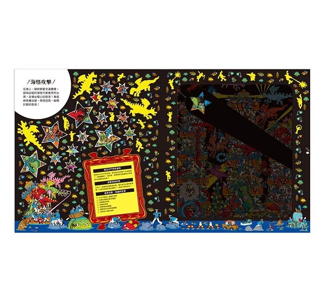 ▌6大妖怪主題 X 新奇任務挑戰 X 經典找找樂趣 本書精心打造6個妖怪主題: 凶惡海盜船、海怪攻擊、地底探險、飛龍訓練、陰森古堡、妖怪晚宴,每個場景都驚喜連連,多重任務等你來破解! 進行一趟暗夜探險之旅,破解千奇百怪的任務 在海盜船上,發現造型獨特的骷顱頭、找出厄運金幣;在海怪出沒的海域中,尋找海怪和水手打鬥的剪影、找出壞掉的燈;在未知的地底下,破解迷宮陷阱、捕捉奇怪的蝙蝠;在飛龍訓練場中,抓回逃脫的飛龍、發現夜空中的奇怪星星;在陰森的古堡裡,找尋畫像中的妖怪、找出有星星圖案的蜘蛛網;在妖怪聚集的晚宴中,鼓起勇氣去認識吸血鬼吧!順便幫助妖怪找回遺失物! 進階任務&趣味角色大追蹤 快來挑戰進階任務,找找威力的鑰匙、沃福的骨頭、文達的相機、白鬍巫師的書卷、奧德羅的望遠鏡。每個場景中還藏匿著各式各樣的有趣小角色,等你來發現! 經典找威力遊戲回歸 威力與他的朋友和敵人們——沃福、文達、白鬍巫師、奧德羅穿梭於全書中,快來尋找他們的身影! 終極關卡登場 還有一個終極關卡!是什麼呢?翻開本書,等你親自揭曉! ▌神奇魔法燈紙板,夜光效果加倍驚喜! 本書附贈「神奇魔法燈」紙板,只要將紙板置於場景頁的透光片之後,就能聚焦畫面中的細節,創造出如舞台聚光燈般的發光效果,彷彿打上Spotlight!神奇魔法燈紙板上覆有特殊「夜光油墨」,在暗處還會閃現神祕的夜光圖案,讓孩子在黑暗中探索更多驚喜,白天與夜晚都能享受不同的閱讀樂趣。本書特色