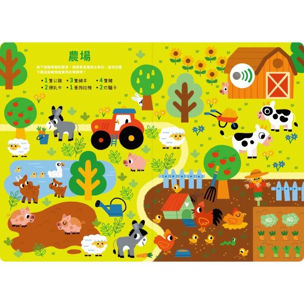 本書收錄48種的聲音,按下音效鍵即可清楚地聆聽到多種東西發出的聲音,像是拖拉機發動、乳牛哞叫、公雞啼叫等,一次認識生活中各式各樣的東西,並提升聽覺辨識能力。