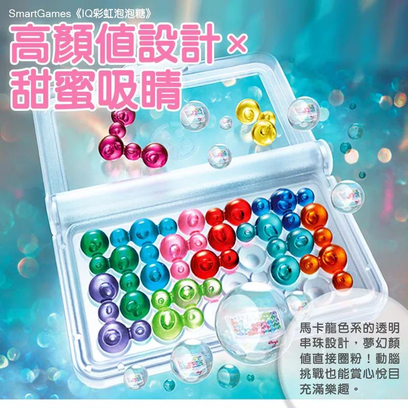 馬卡龍色彩的《IQ彩虹泡泡糖》,晶瑩剔透、宛如夢幻糖果般閃耀!大小串珠搭配凹槽遊戲盤,必須透過旋轉、翻面才能精準放入。玩家在動手挑戰中,自然培養專注力、空間概念與解題策略。120 道題目循序漸進,帶來層層挑戰與滿滿成就感!無論是親子同樂還是獨自挑戰,都能在繽紛遊戲中玩出智慧與樂趣!