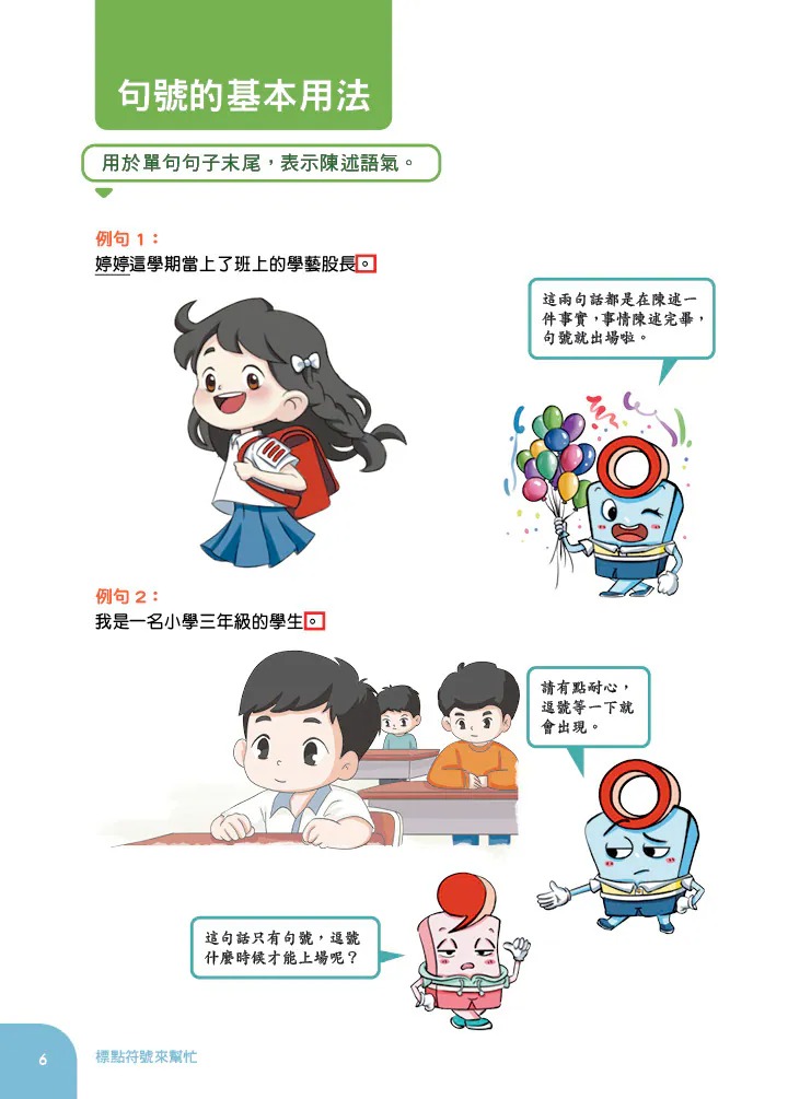 趣味漫畫,快樂學習:採用可愛童真的漫畫和憨態可掬的「橡皮人」,讓孩子在逗趣、活潑的漫畫情境中學習標點符號相關知識。將標點符號擬人化,成為「文章得力助手」,讓學習過程不再枯燥無味,反而覺得趣味盎然。