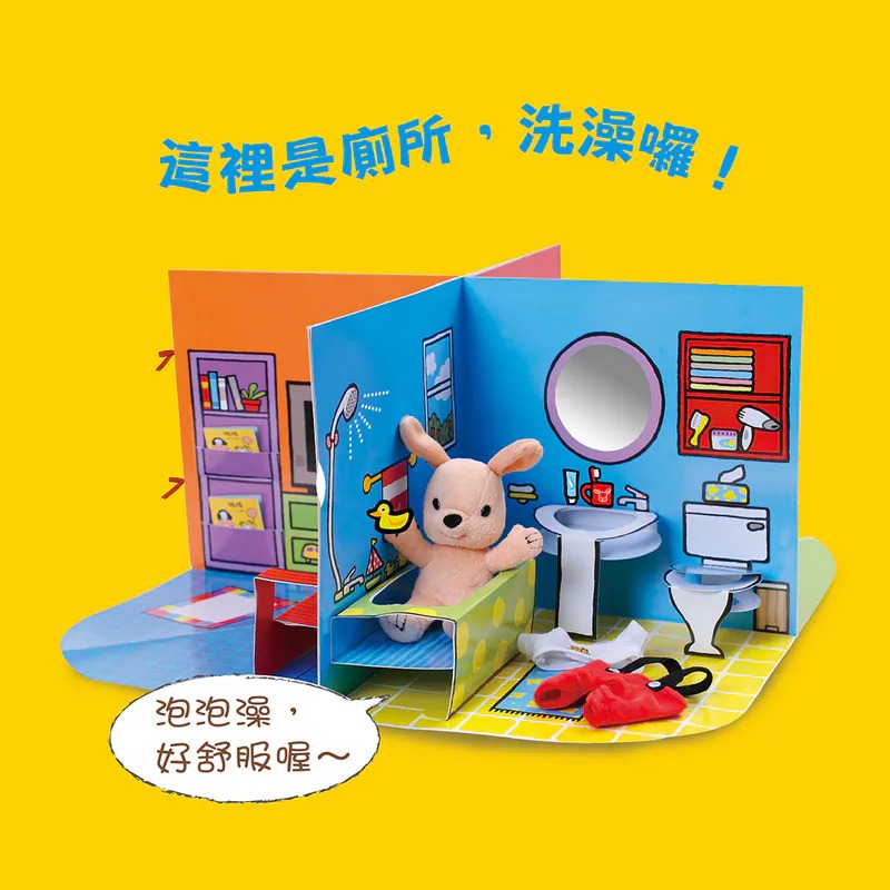 ★浴室:豆豆要洗澡了,讓孩子帶著豆豆到浴室,脫掉衣物,先沖沖水、抹肥皂,再把身體沖乾淨後,就可以帶著豆豆到浴缸裡泡泡澡,豆豆會覺得很舒服喔!睡覺前,也別忘了先到浴室刷牙、上廁所喔!
