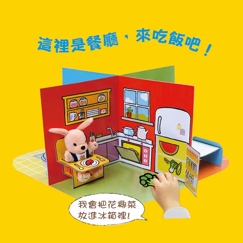 翻開立體書,你可以讓孩子先觀察,說一說有哪些場景?想帶豆豆和好朋友到哪一個房間裡玩?再拿出遊戲貼紙,讓孩子將該場景附贈貼紙撕下,貼在該場景上一起玩遊戲!