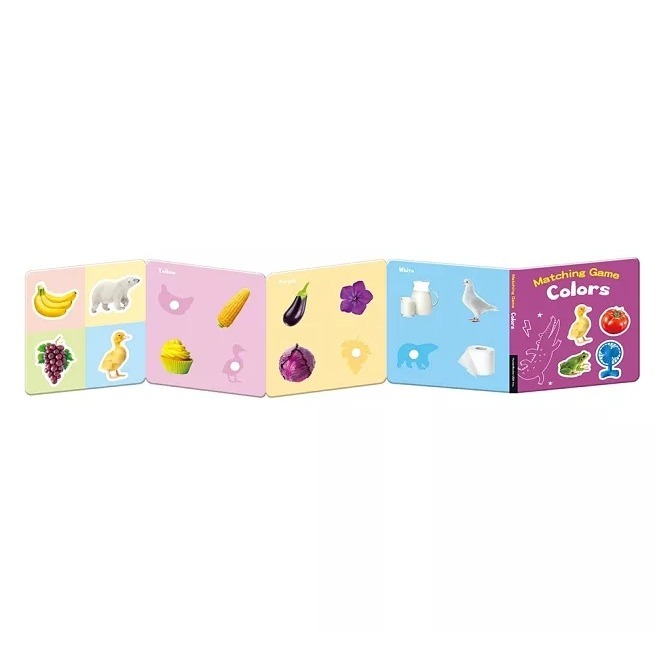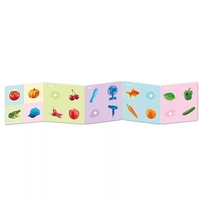 書中介紹紅、藍、橘、綠、黃、紫、白七種顏色。每種顏色各選四種日常生活中常見的物品為例,如蘋果、樹葉、香蕉等,藉此強化孩子的辨色與認知能力。