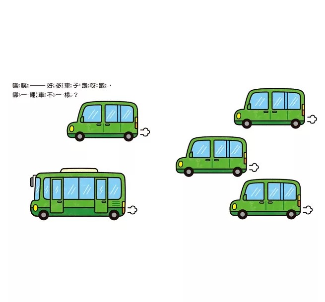 除了書中固定的「哪一輛車不一樣?」問題之外,爸媽可以延伸和孩子討論:「這輛車有哪裡不一樣?」、「這輛車是什麼用途?」、「你最喜歡哪一輛車?」等問題,讓孩子有更多表達想法的機會,增進親子間的互動樂趣,也能讓孩子學習如何組織語言。