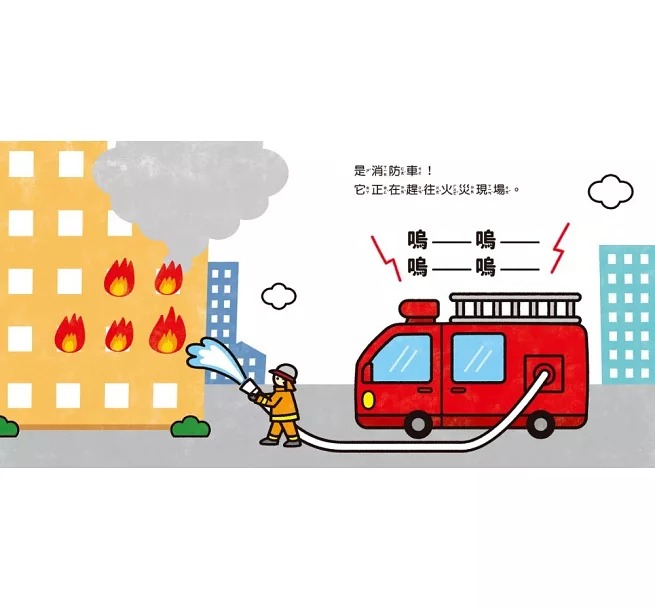 根據2~4歲孩子的理解程度設計車子的外形,線條簡潔、用色鮮明,差異之處正好與該種工作車的用途或特色有關,例如消防車的差異之處是雲梯和高壓水槍,用途是「趕往火災現場」救火;救護車車頂有著紅色的警示燈,因為它「會將傷患和病人送往醫院」,緊急時刻需要鳴笛亮燈,提醒其他車輛讓道……孩子可以自己找找看有哪些不同的地方,家長在旁適時補充其設計用途,讓孩子不僅能夠在「找到了!」的瞬間感受到喜悅與成就感,也能培養觀察力與專注力。